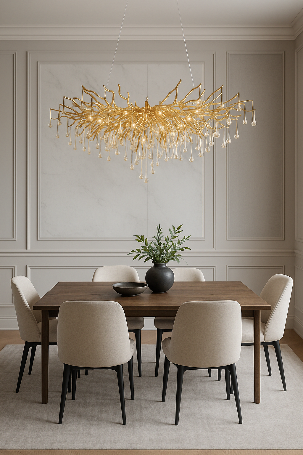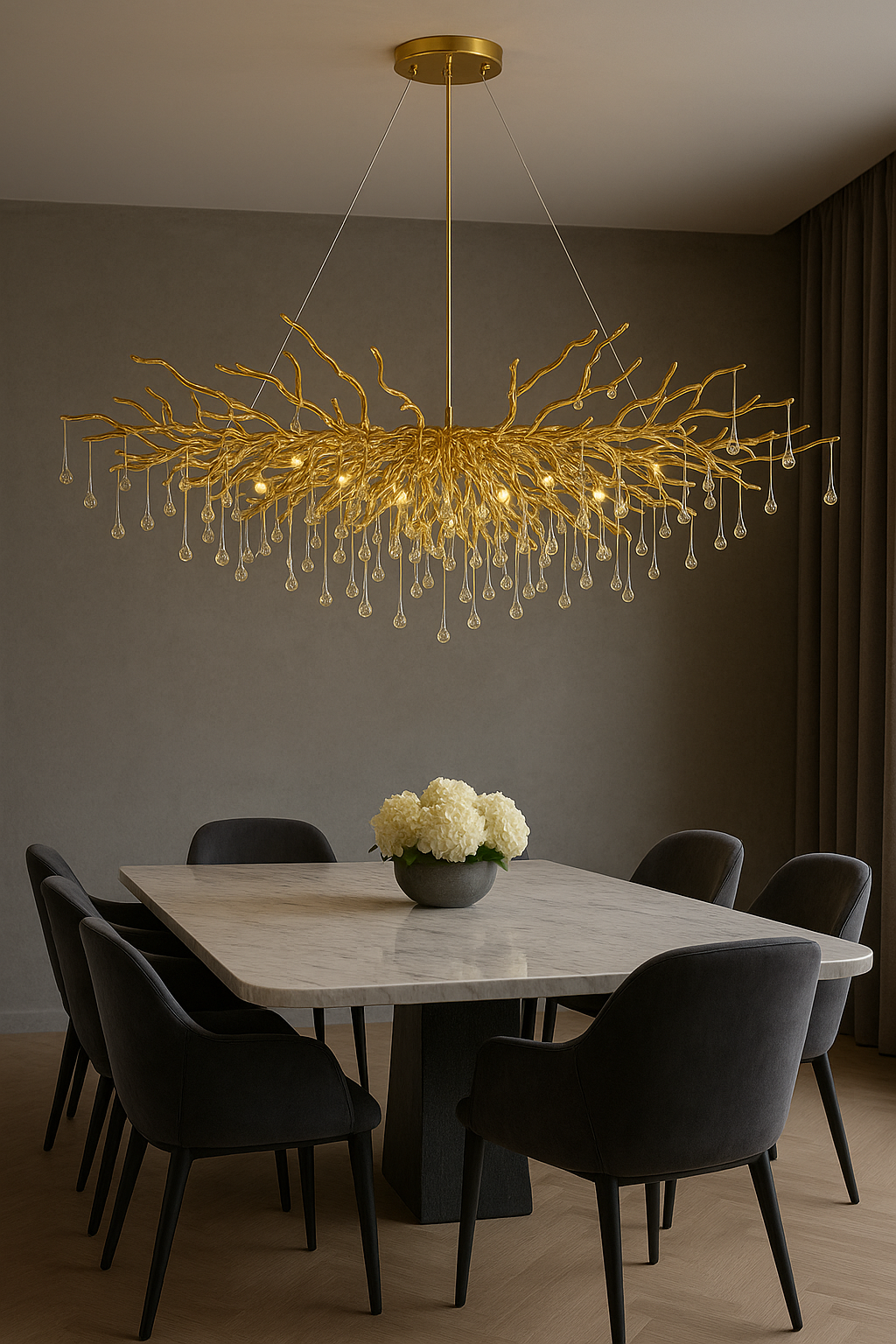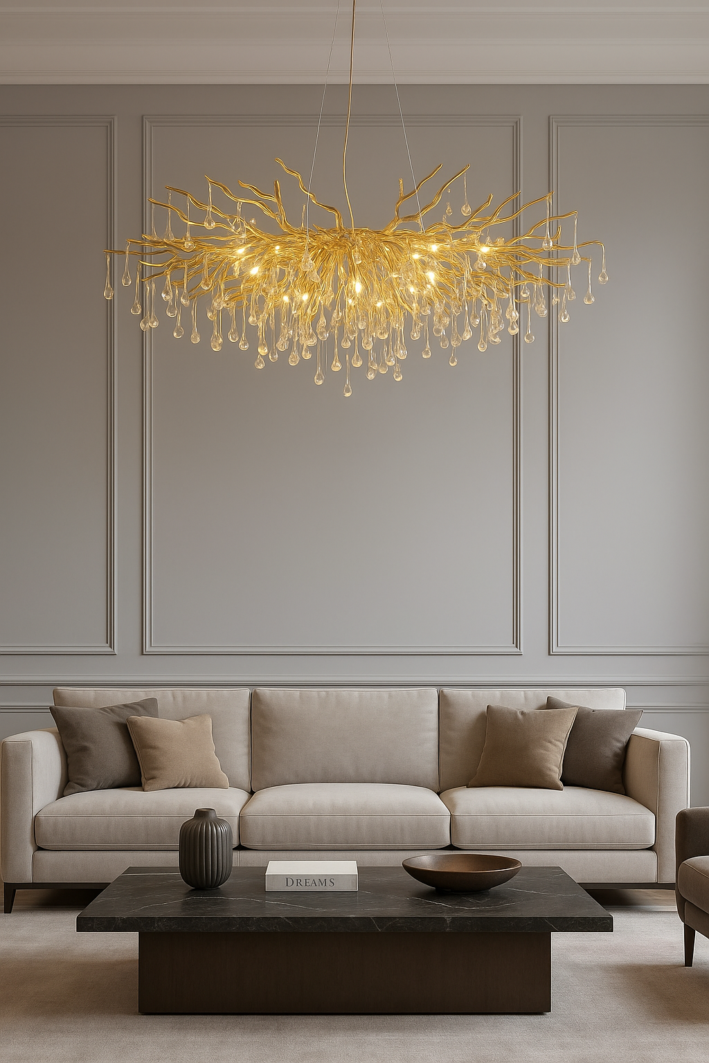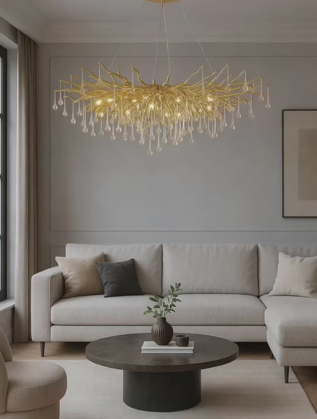 Förvandla ditt hem med vår eleganta ljuskrona, smyckad med högkvalitativa K9-kristaller som gnistrar likt morgondagg på ett förtrollande skogsträd. Den unika designen kombinerar modern minimalism med tidlös elegans och skapar en atmosfär av lyx och magi i ditt vardagsrum eller sovrum. Denna ljuskrona är inte bara en belysningsarmatur utan ett konstverk – en äkta guldkrona som förhöjer varje rum med sin sofistikerade charm och briljans.
