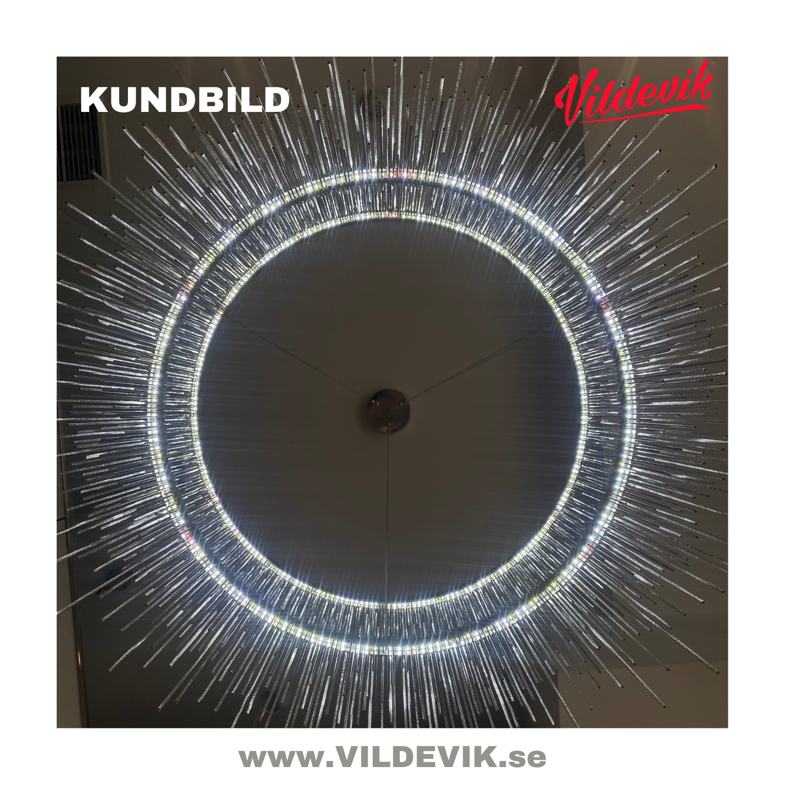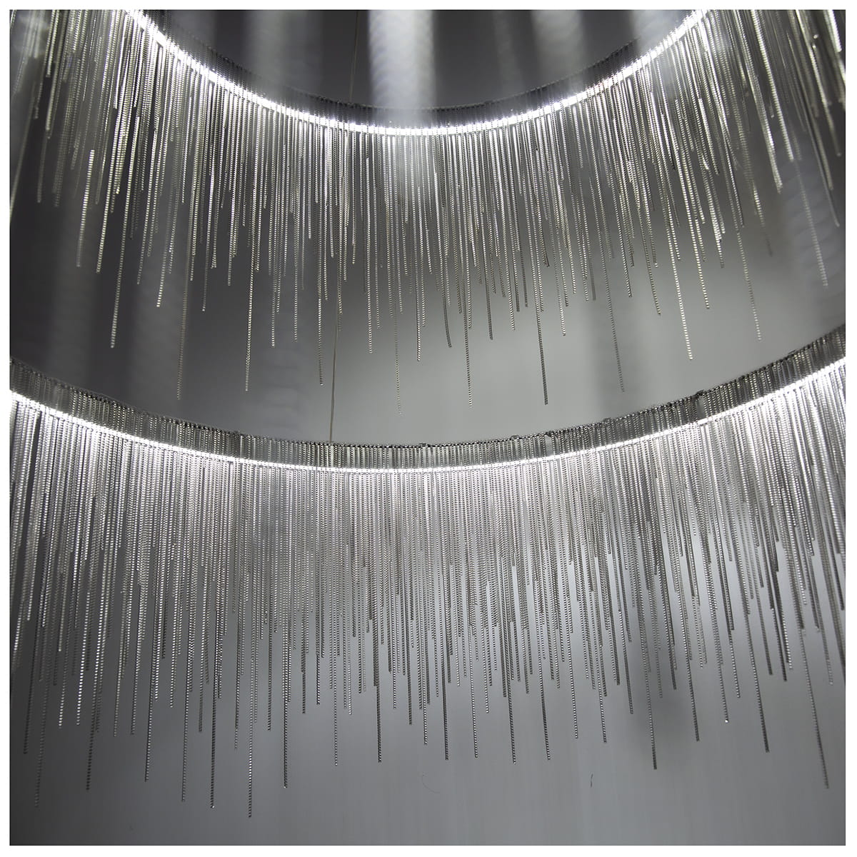 Upplev en spektakulär kombination av design och funktion med vår Fontanna taklampa, inspirerad av en solbelyst fontän. Denna unika designlampa fångar omedelbart uppmärksamheten oavsett om den är tänd eller släckt – tack vare sina hundratals glittrande silverkedjor som reflekterar ljuset på ett magiskt sätt.