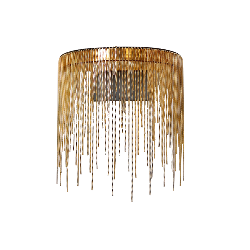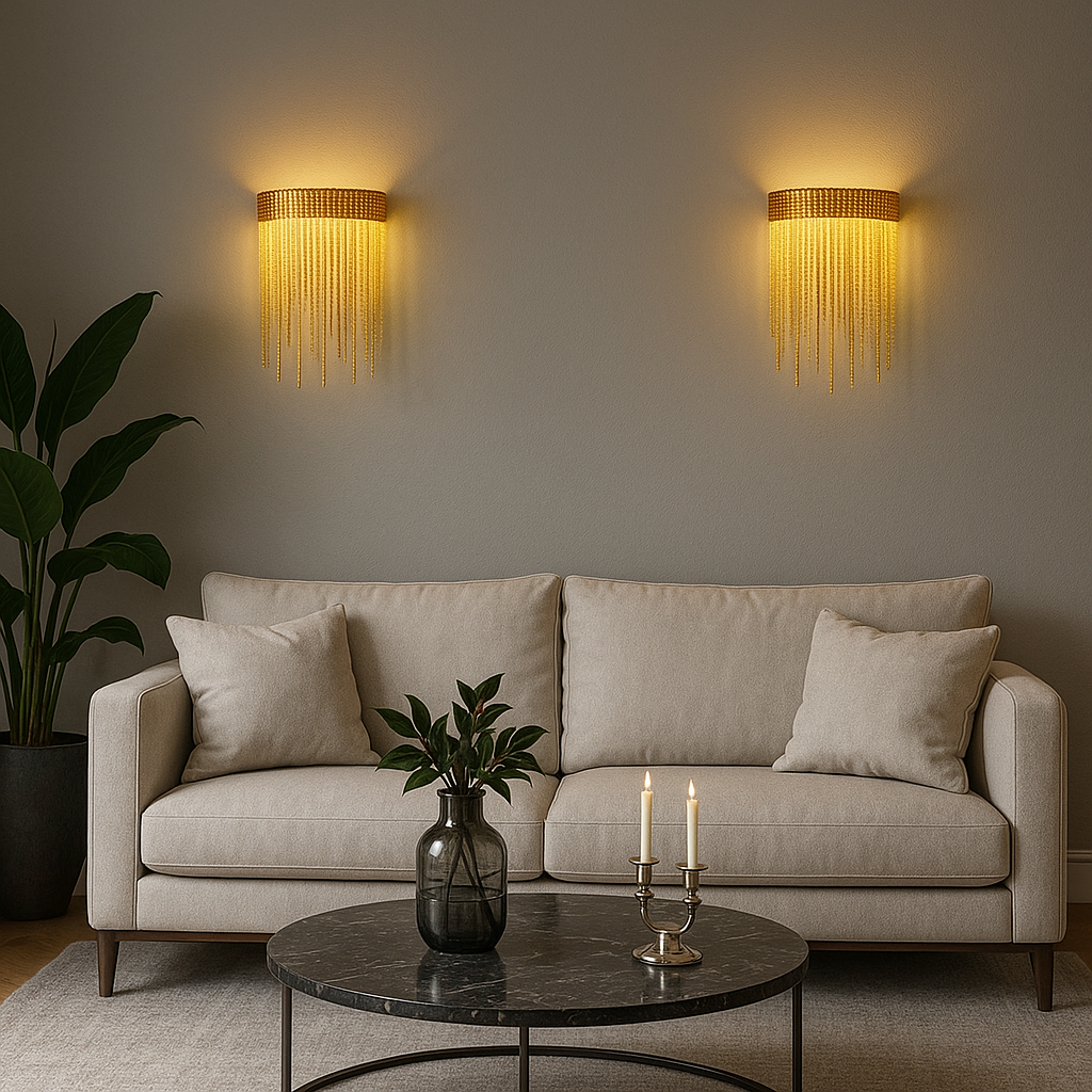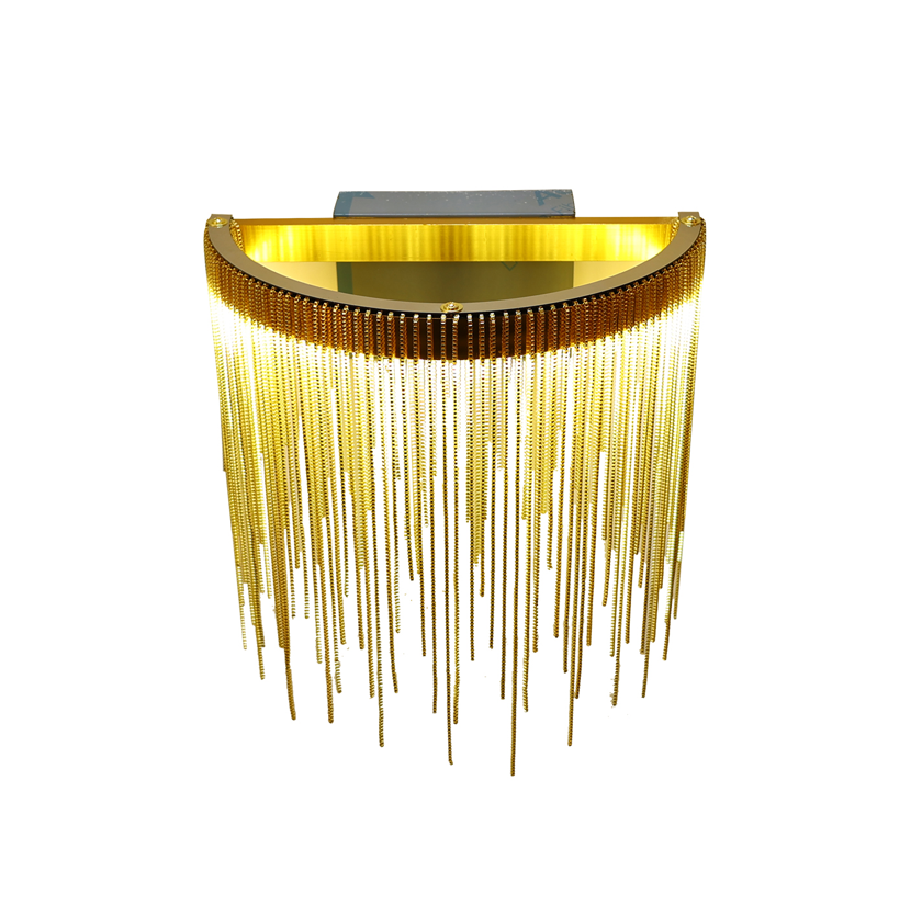 Som en förtrollande solbelyst fontän fångar denna exklusiva vägglampa omedelbart allas blick, oavsett om den är tänd eller släckt. Med över 100 skimrande guldkedjor som pryder lampans yta, skapar den en unik känsla av lyx och elegans i ditt hem eller kontor.